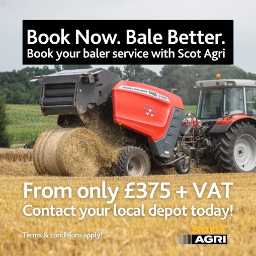 Terms and conditions: Offer ends 28th February 2026, valid on round balers only, £375 service is for workshop-based service only, additional travel costs apply for alternative locations. Scot Agri reserves the right to withdraw this offer at any time.